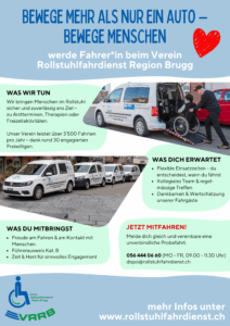 Der Verein Rollstuhlfahrdienst Region Brugg wurde 1986 unter dem Namen Verein Behindertenbus Region Brugg gegründet und darf 2026 bereits sein 40 jähriges Bestehen feiern.
